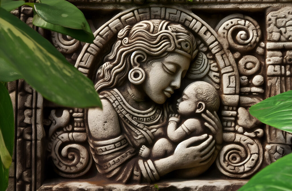 Base Image generated by Microsoft Designer with prompt: weathered stone carving of woman and newborn in ancient Mayan style