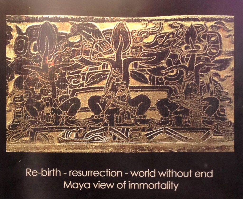 In the Sacred Maya Temple Ceremony, the Elders tell of babies coming from Heaven. As they grow and live on the earth they are taught by their parents to do good. They are tempted by the adversary. But as they live their lives the way their parents have taught them, when they die, their spirits are resurrected back into heaven from whence they came, to live with their ancestors.